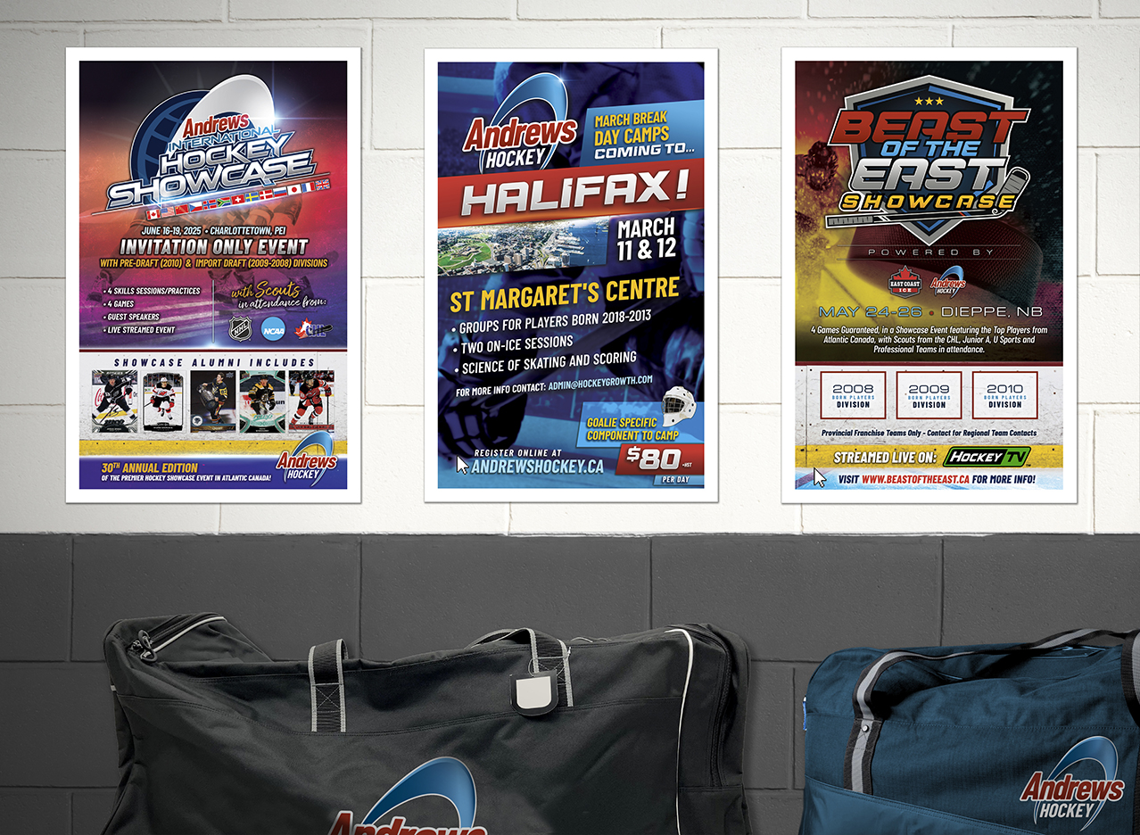 As part of Andrews Hockey’s growth strategy back in 2016, the initial Seamless Brand / Andrews Hockey partnership was focused on marketing the brand as the ‘#1 Hockey School in Eastern Canada’. Over the last 8+ years we’ve provided ongoing support with branding, strategy, team logos, social media, uniform designs, print materials, display walls and event materials to accelerate brand awareness.